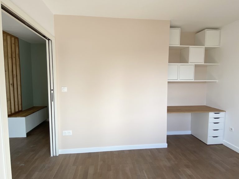 Et voici le coin bureau dans cette pièce multifonctions qui a été ouverte sur le séjour et qui permet de s’isoler grâce à l’installation d’une double porte à galandage.