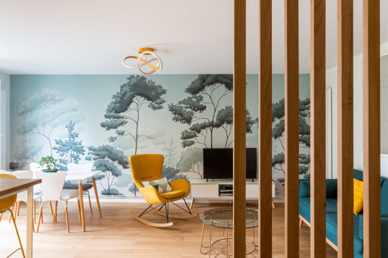 Enfin le mur principal donne le ton et se pare d’un décor mural théâtral qui fait écho au parc très arboré qui se cache en lisière derrière les murs de cet appartement.