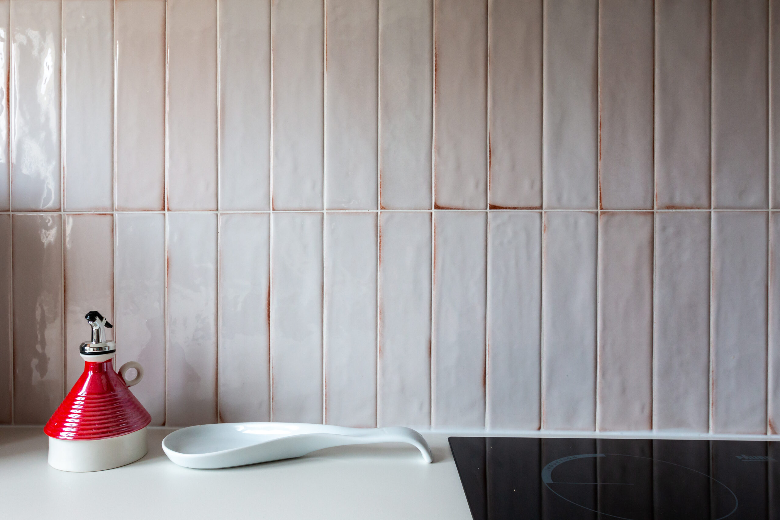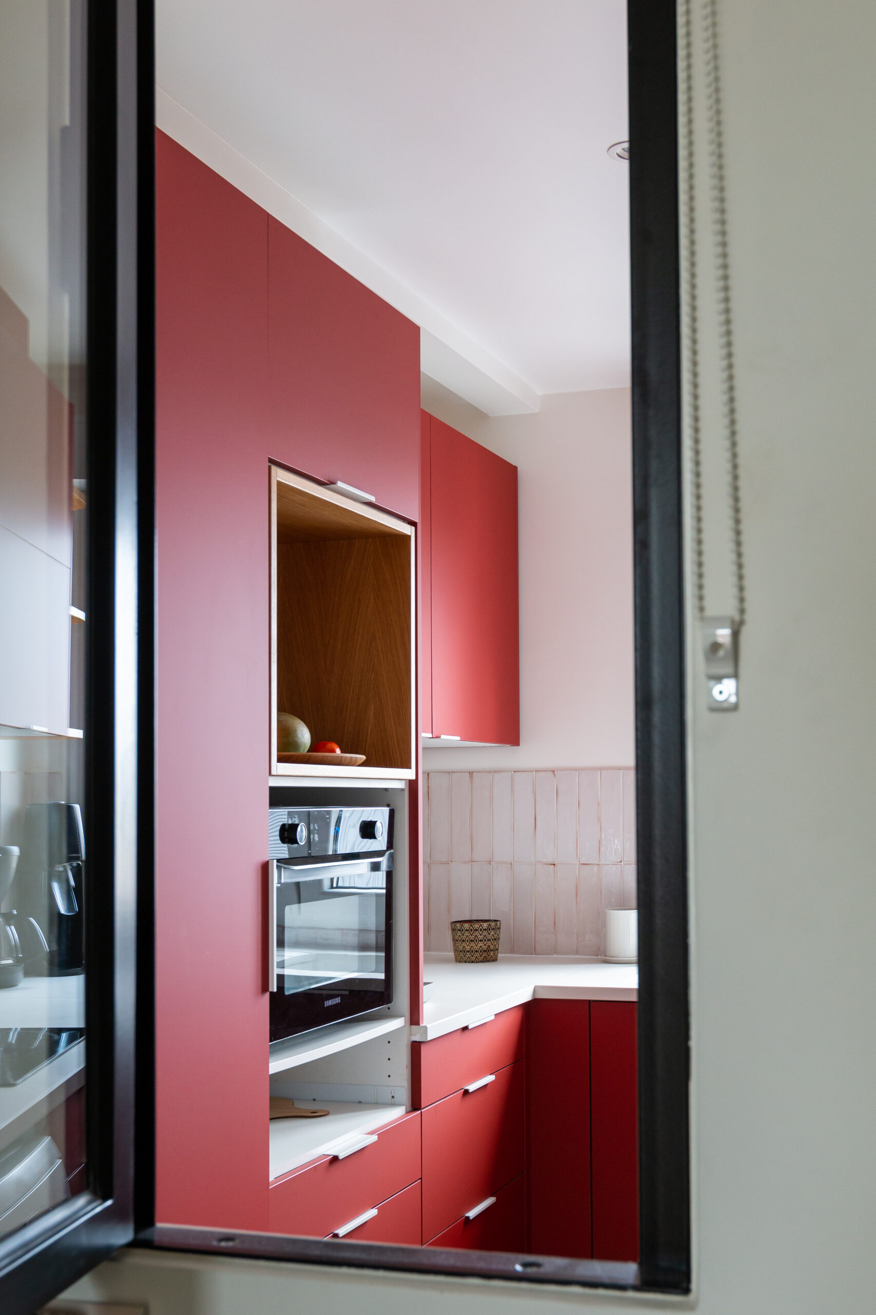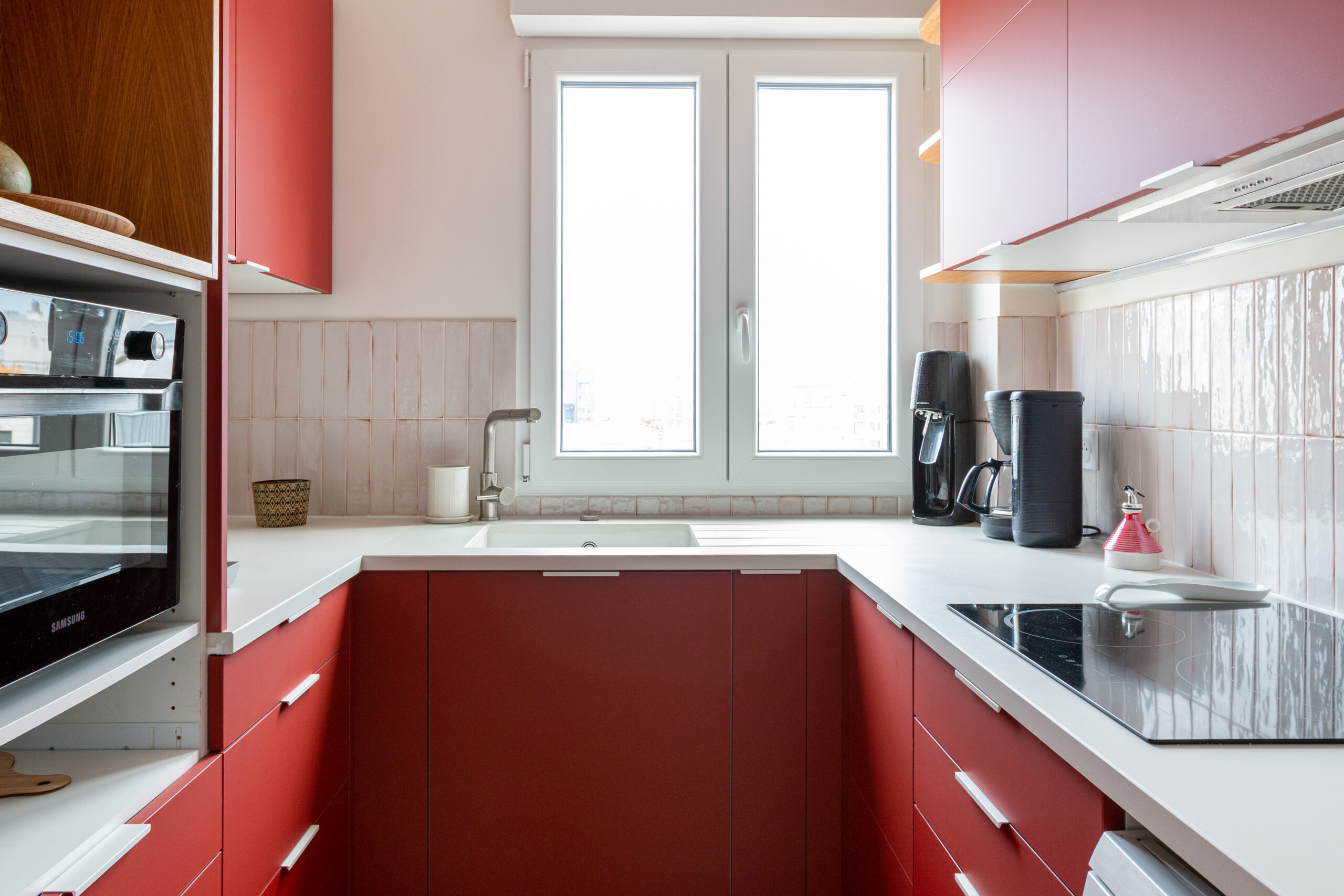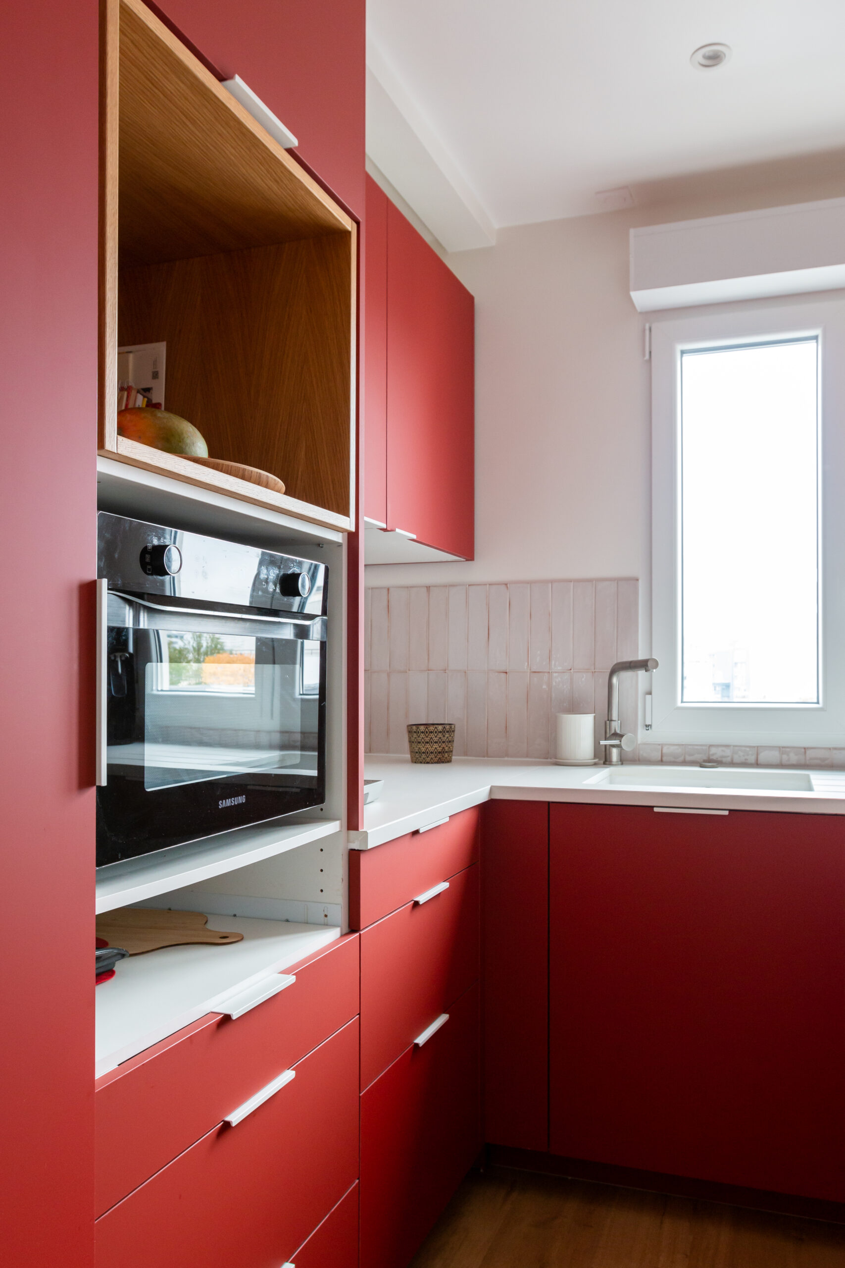 Nous avons joué la carte de la couleur brique assumée avec un plan de travail clair en céramique, une crédence carrelée dans les tons rosés en rappel des façades, des étagères et finitions en chêne naturel.