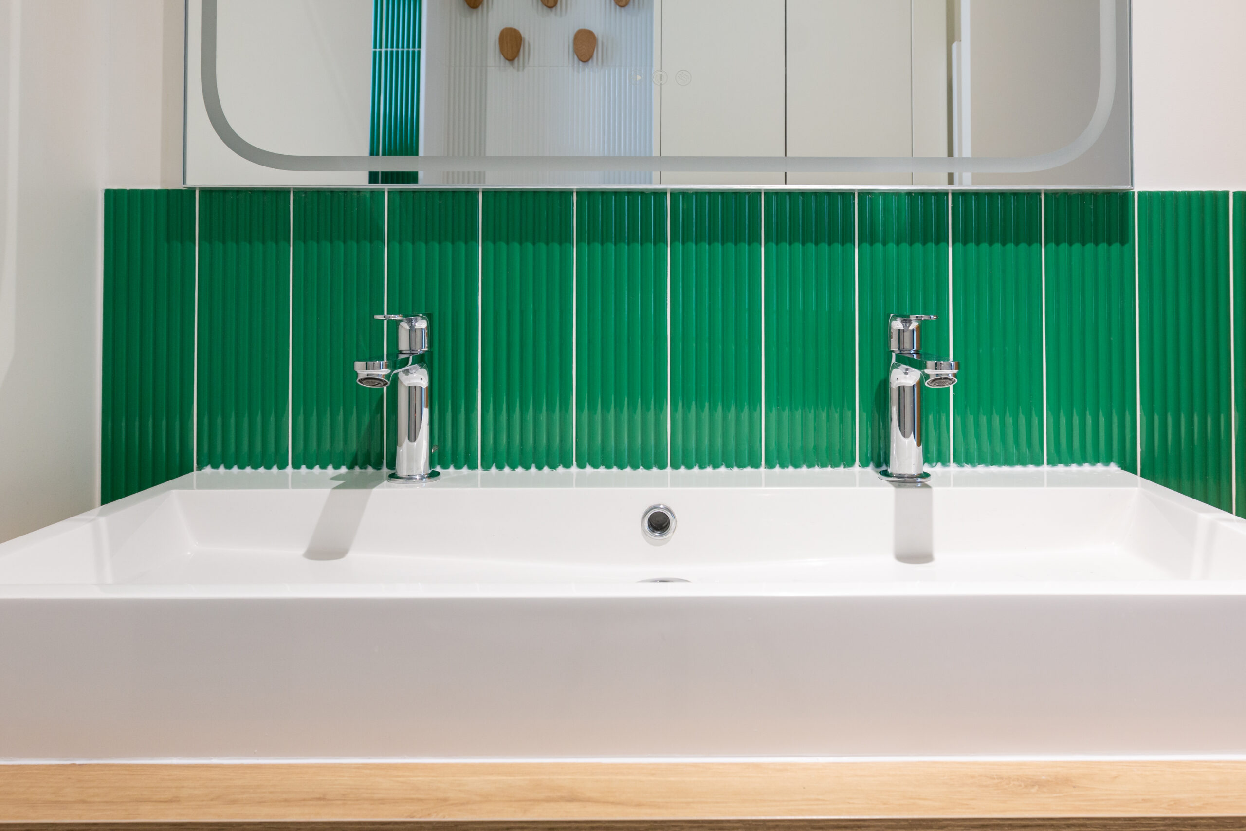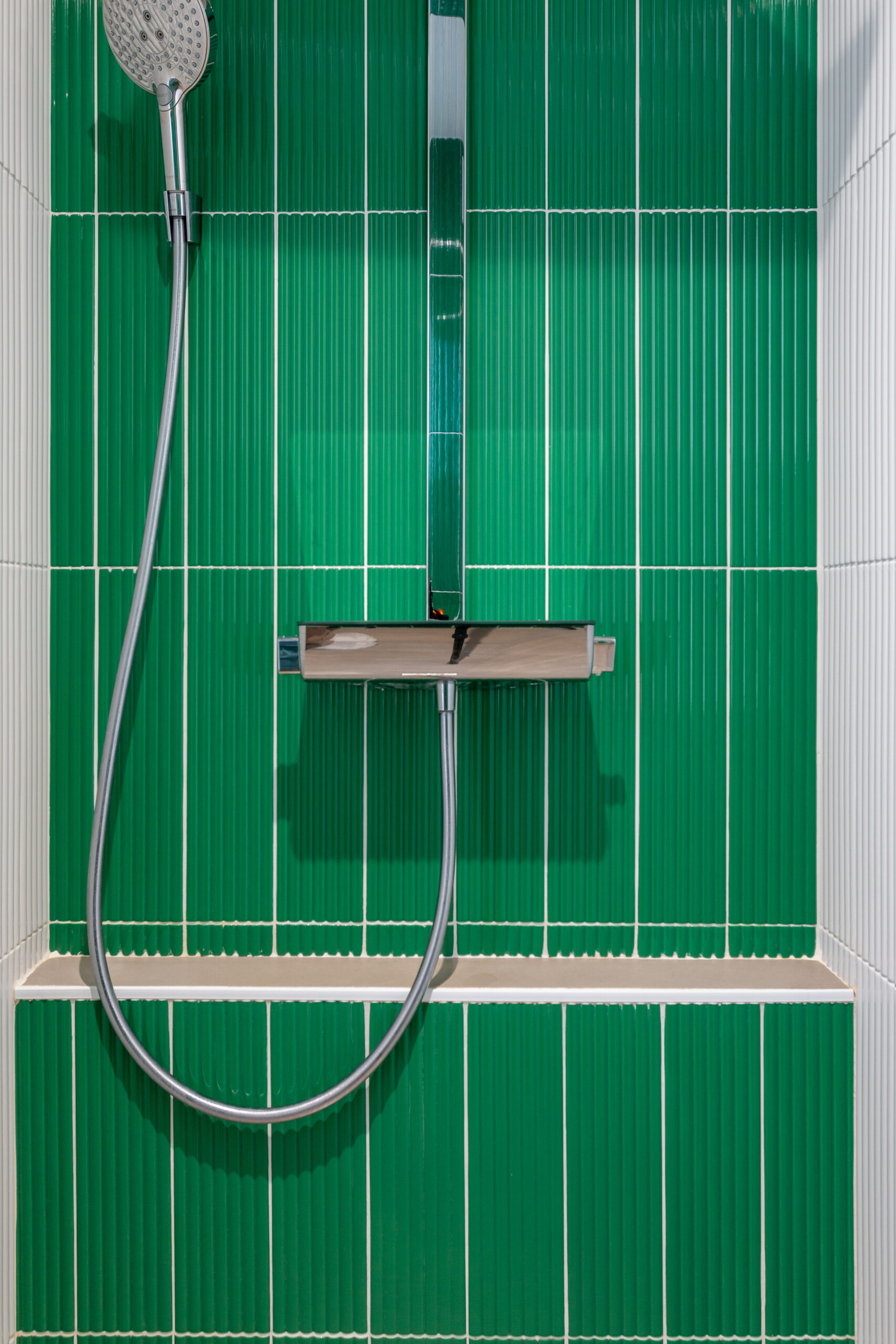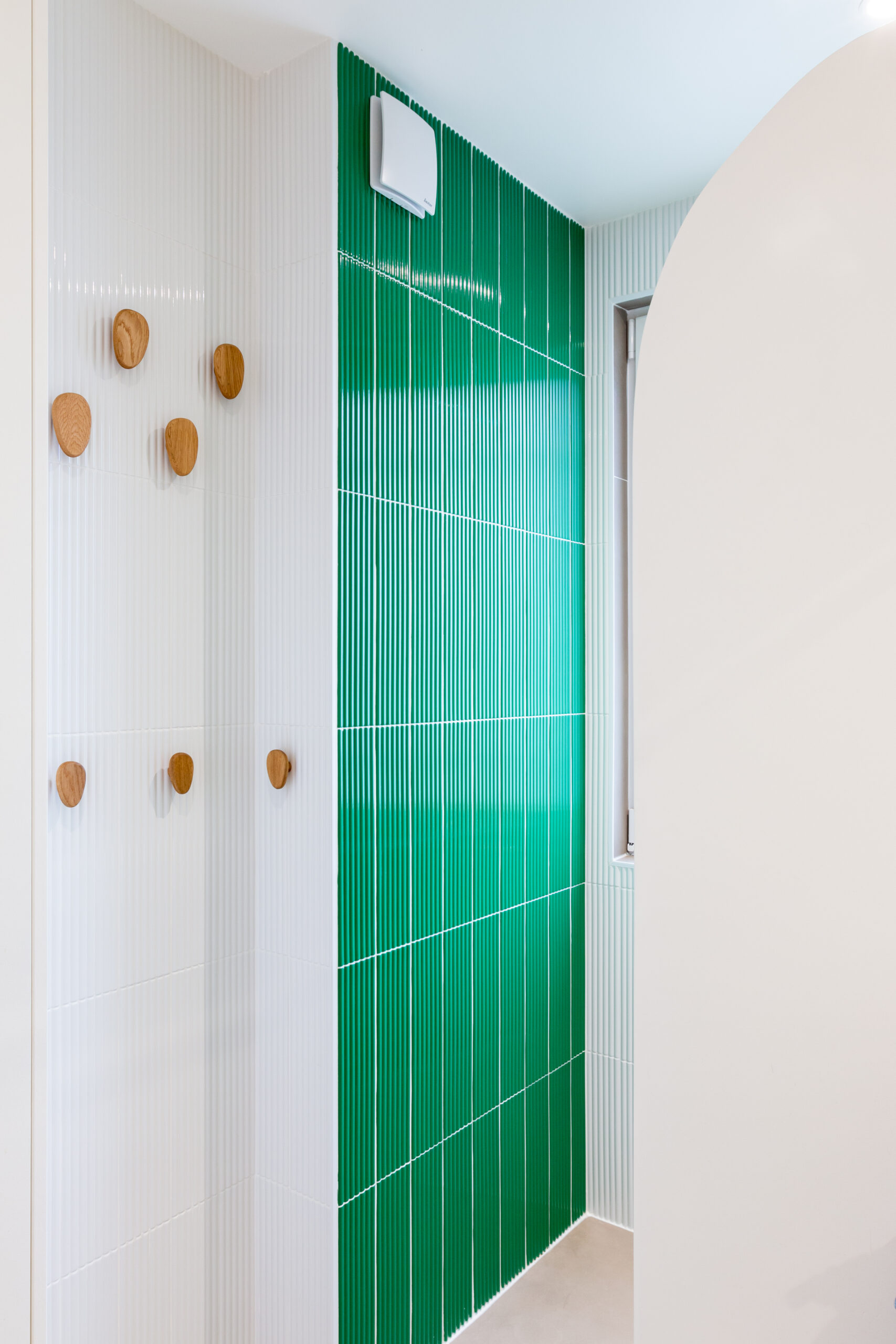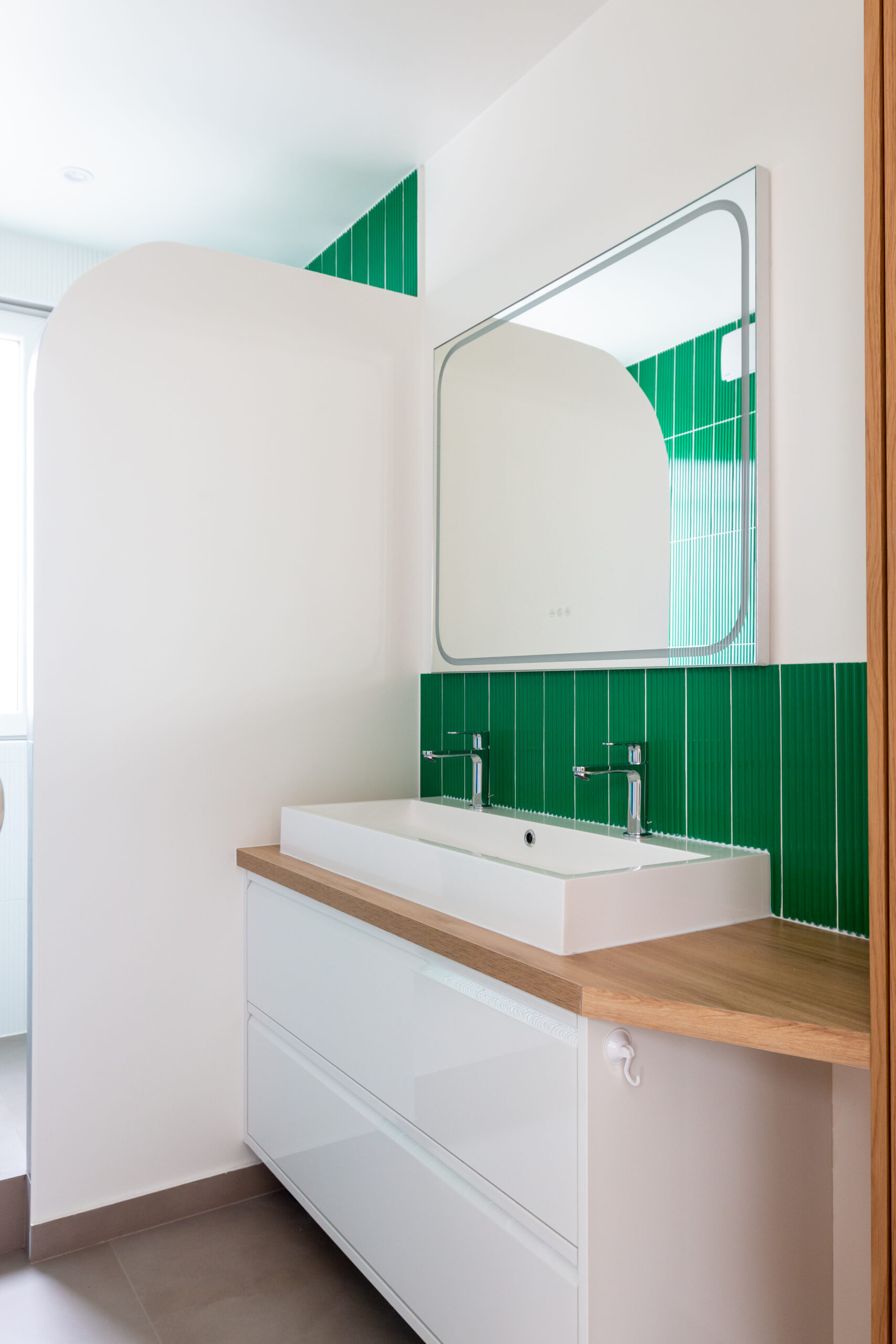 La salle d’eau et les WC avec la faîence murale très graphique en relief en mix vert et blanc.