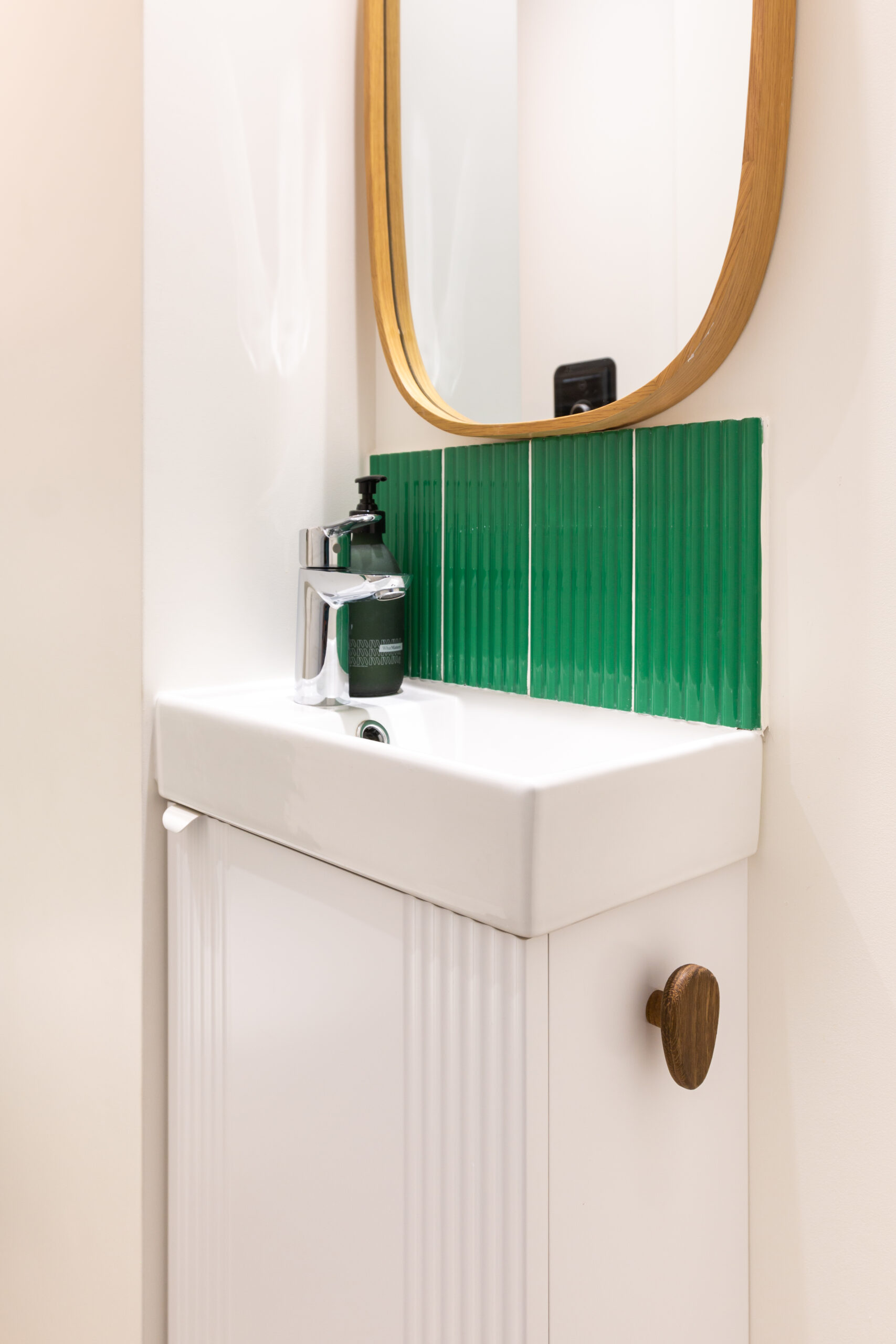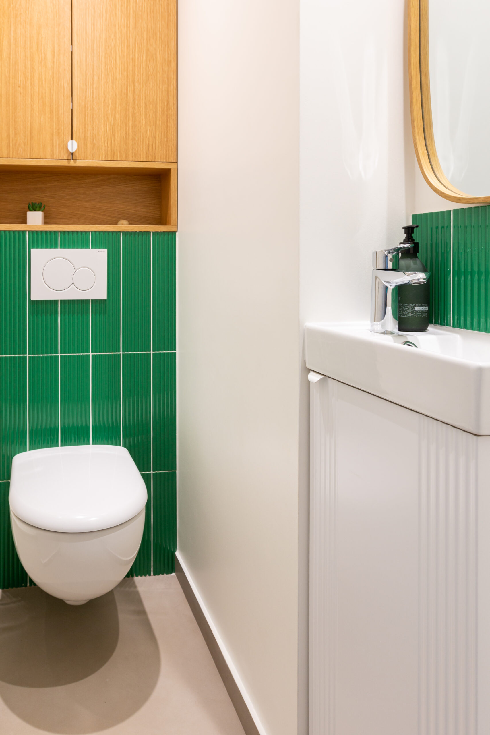Dans les WC, un meuble haut sur mesure en chêne au-dessus des WE, et un lave-mains avec façade en rappel de la crédence.