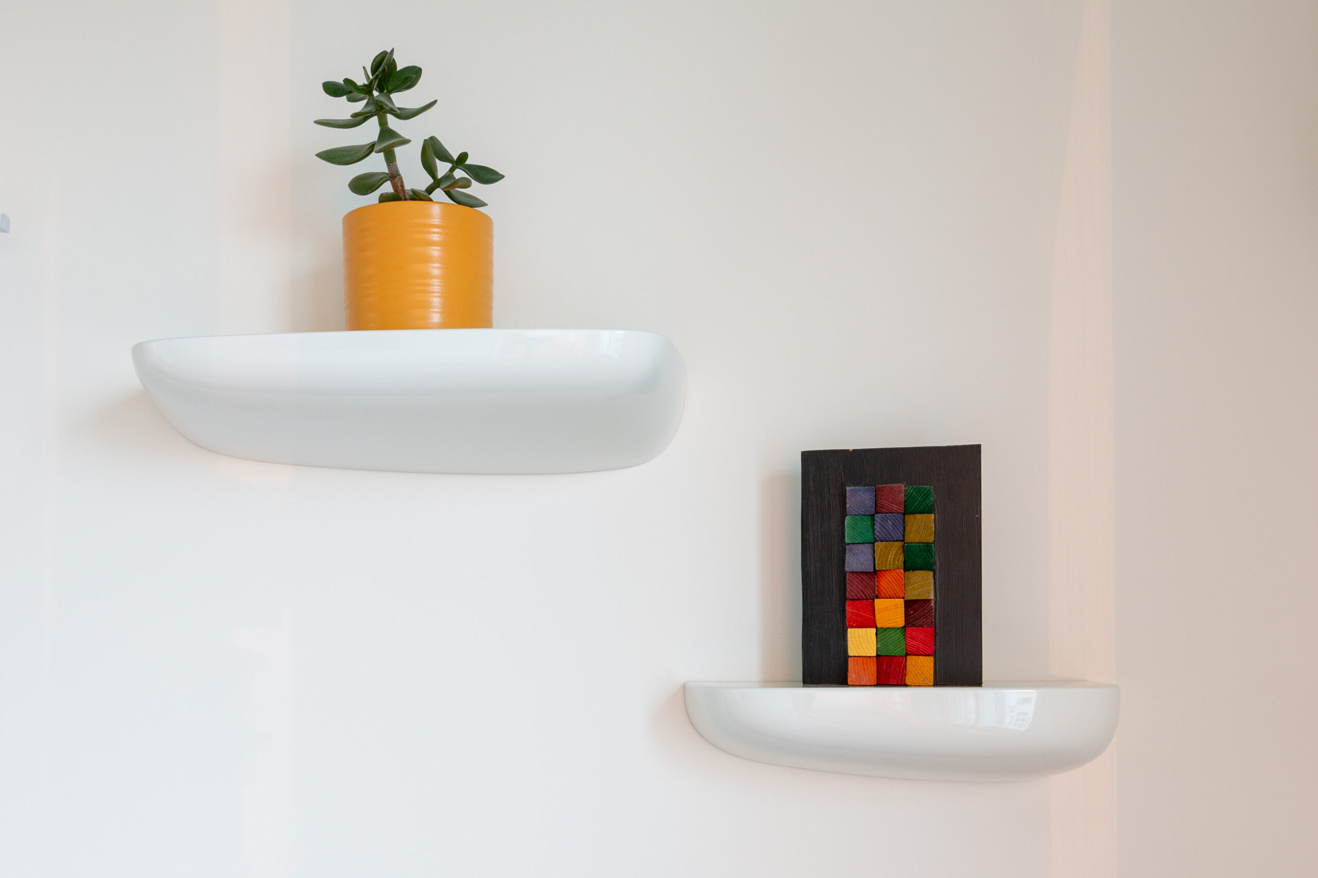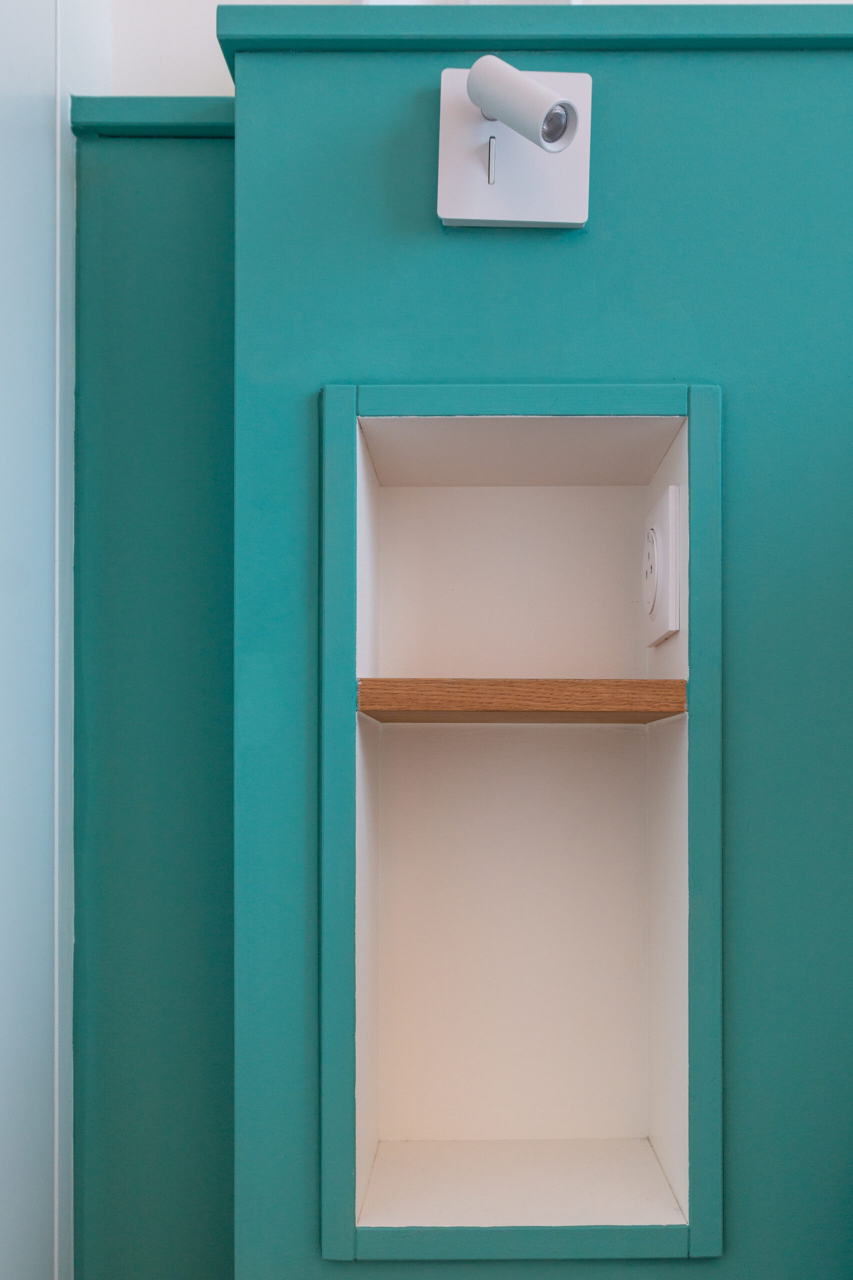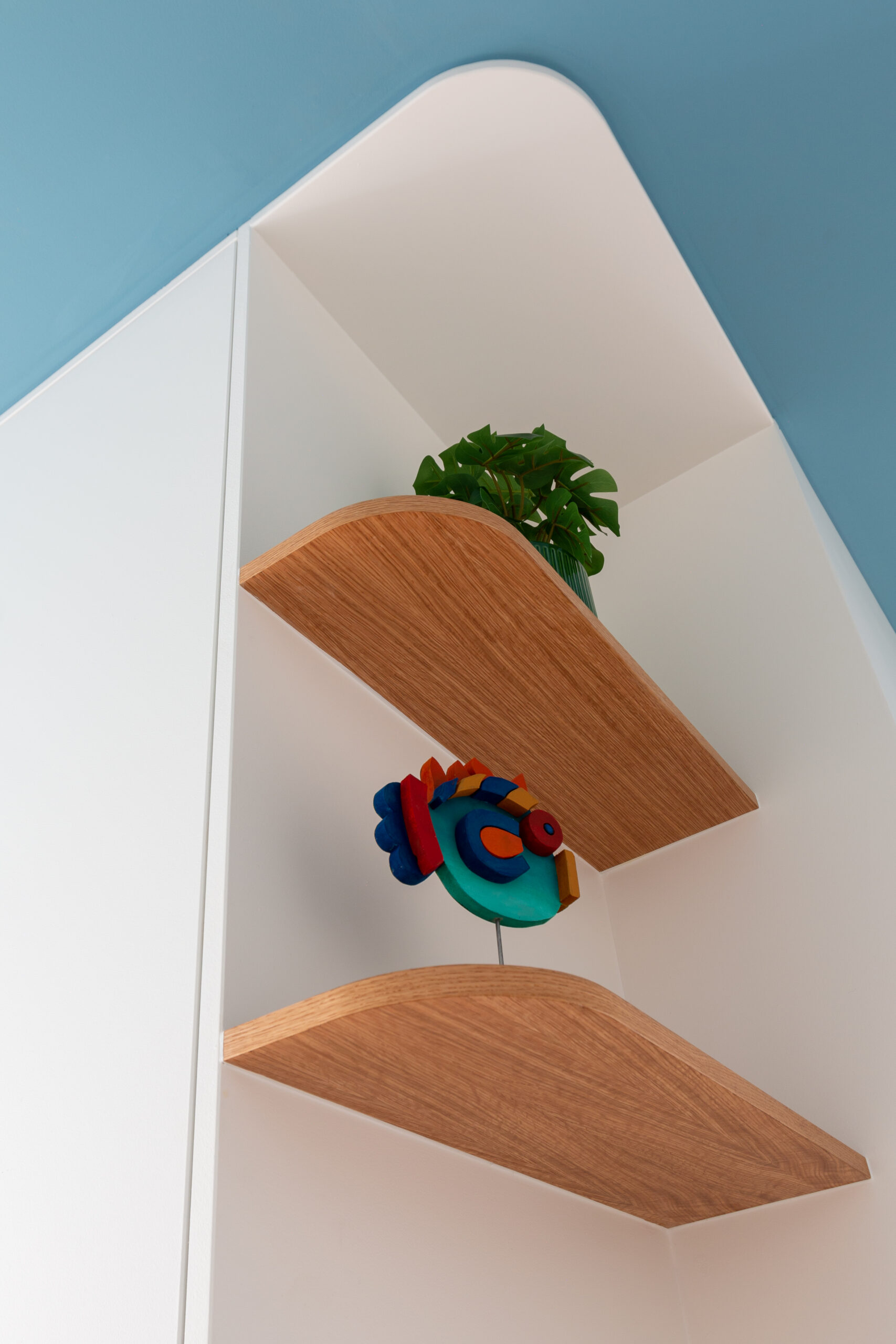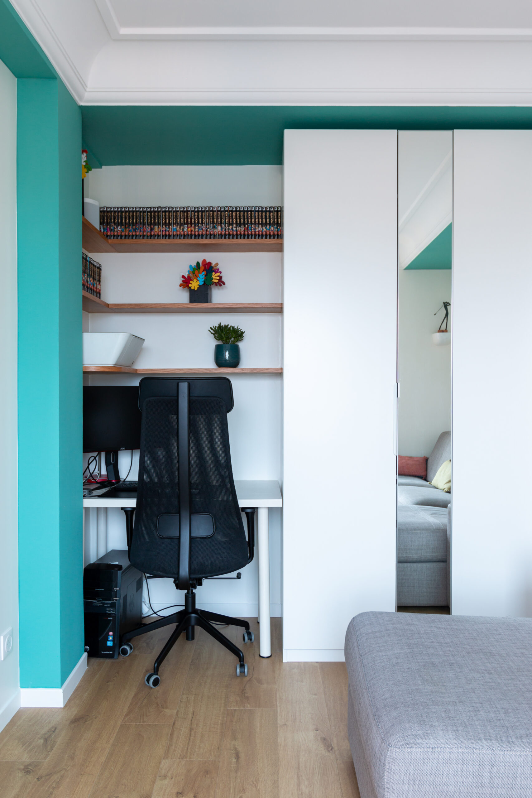 Zoom sur l’espace bureau/chambre d’amis. La couleur se joue par touches, sur le poteau porteur et les corniches du plafond. Un bureau sur mesure a été réalisé dans la continuité du dressing d’angle, avec des étagères en bois finition arrondie.
