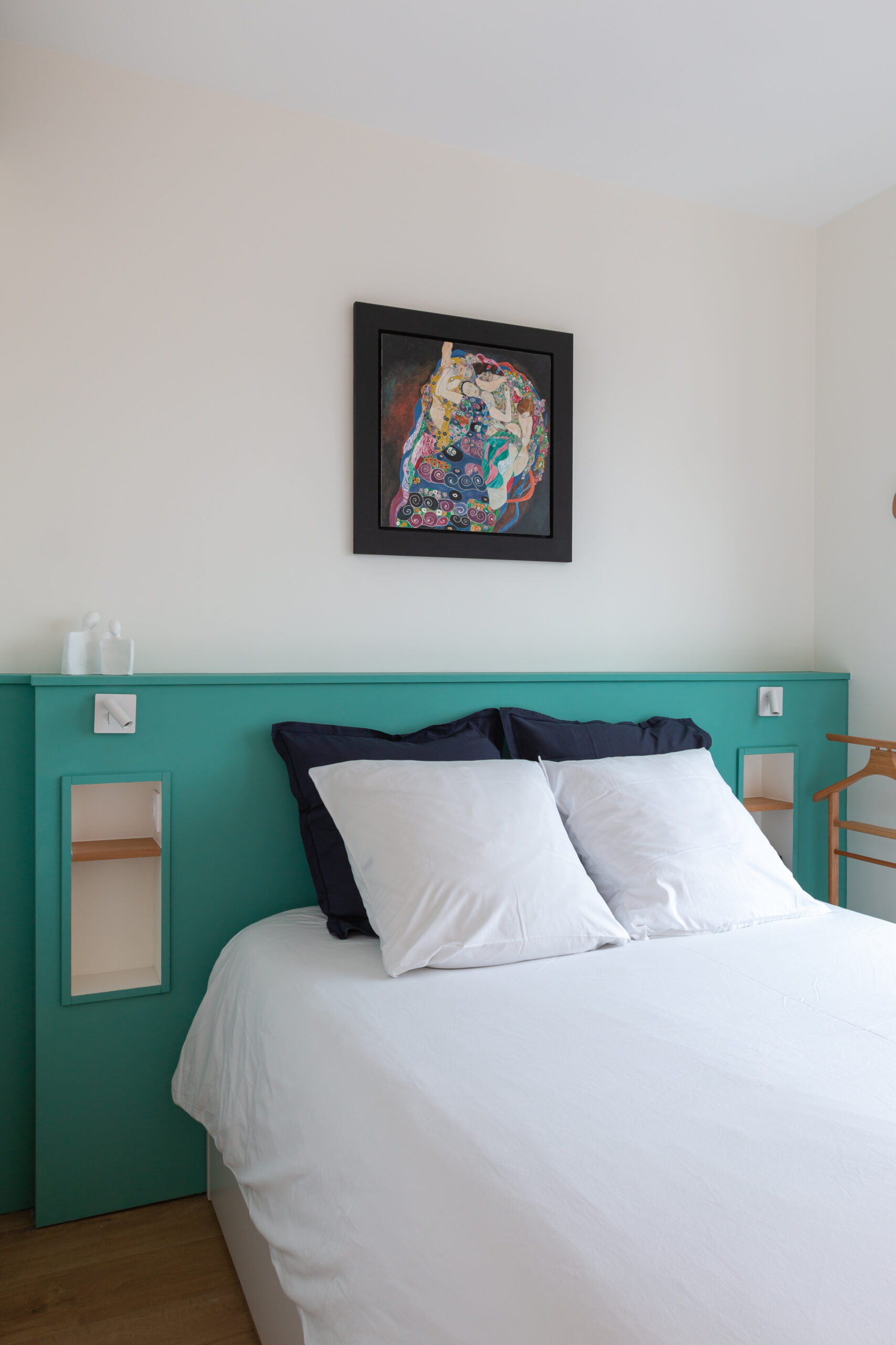 Dans la chambre parentale, une tête de lit sur mesure peinte dans un vert vitaminé et un dressing du commerce oprimisent le rangement et l’espace.