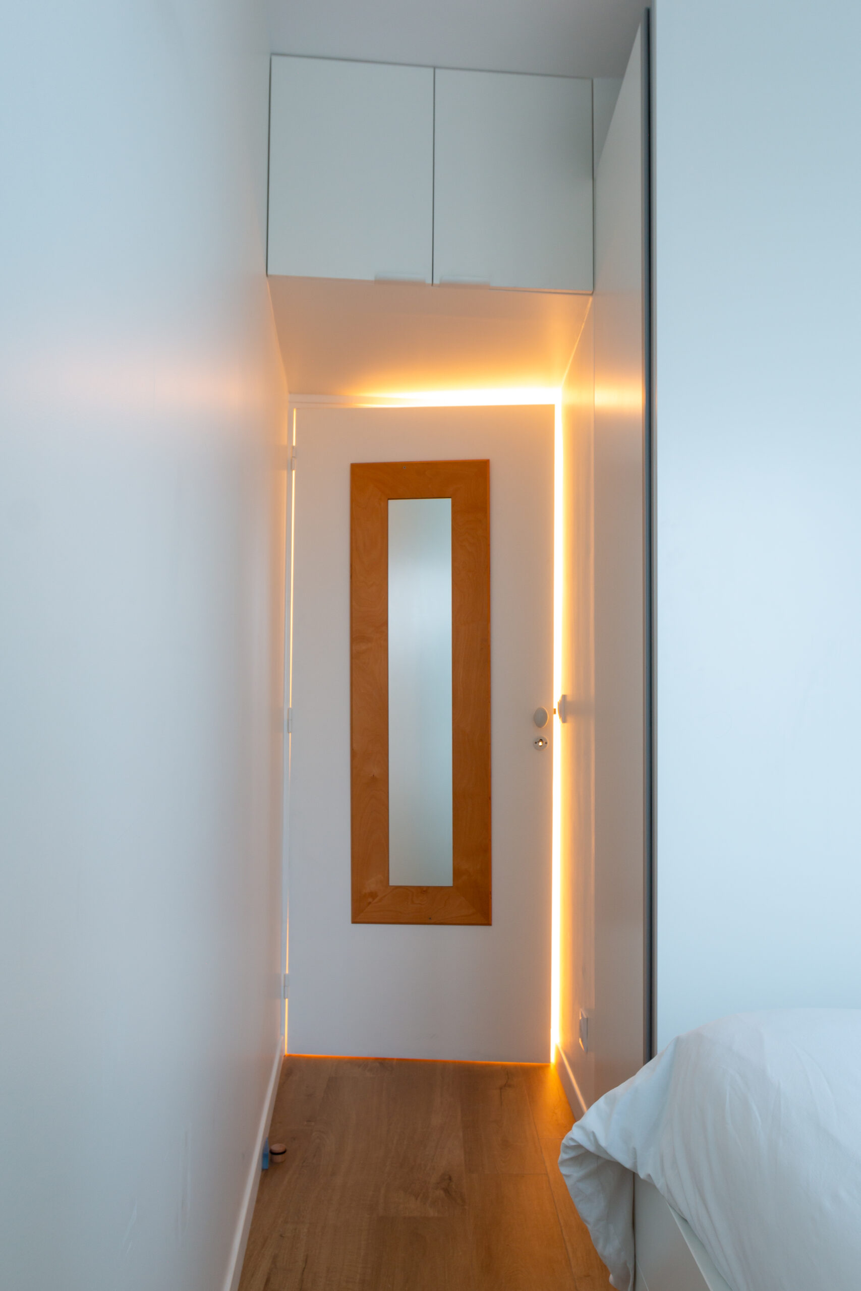 Celui-ci comporte un grand dressing sur mesure, avec de jolies poignées en bois et un banc accueillant dès l’entrée dans l’appartement.