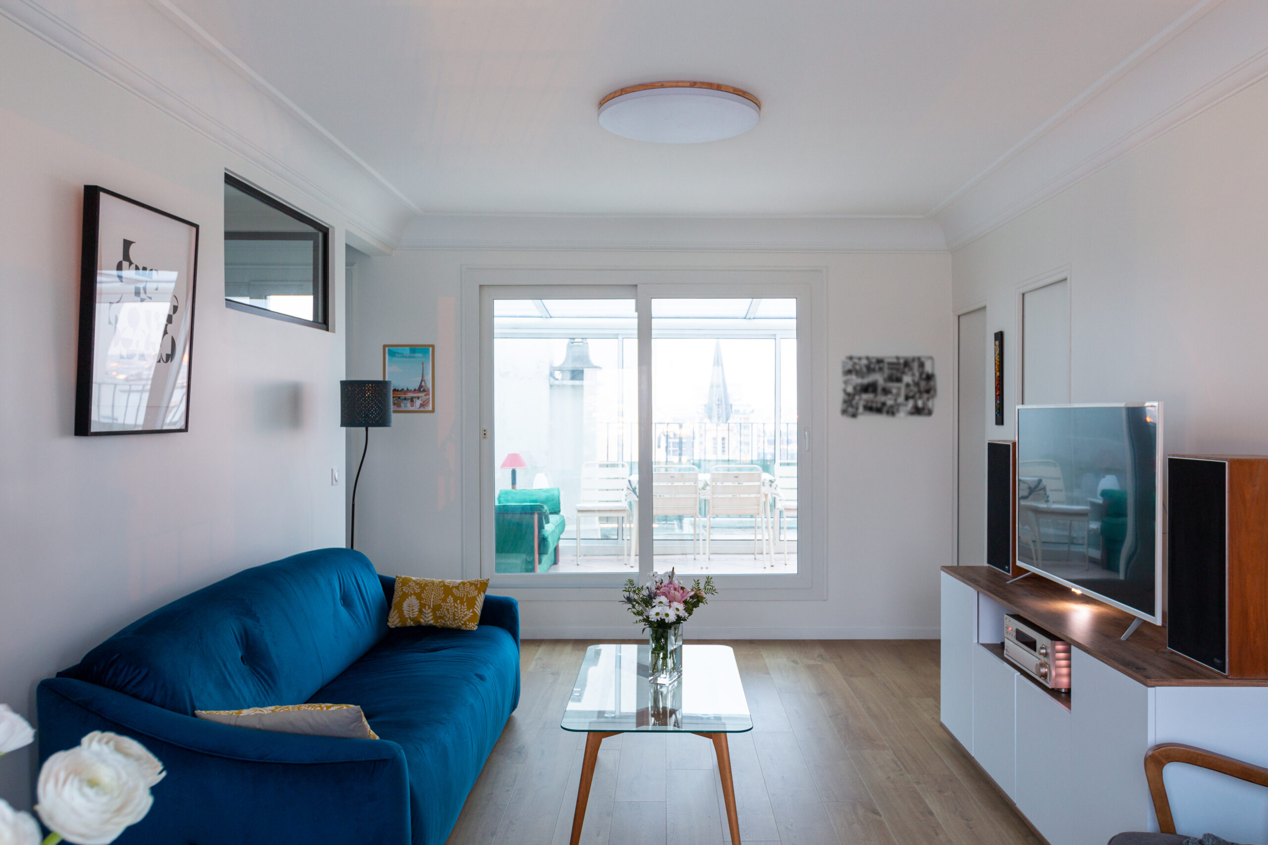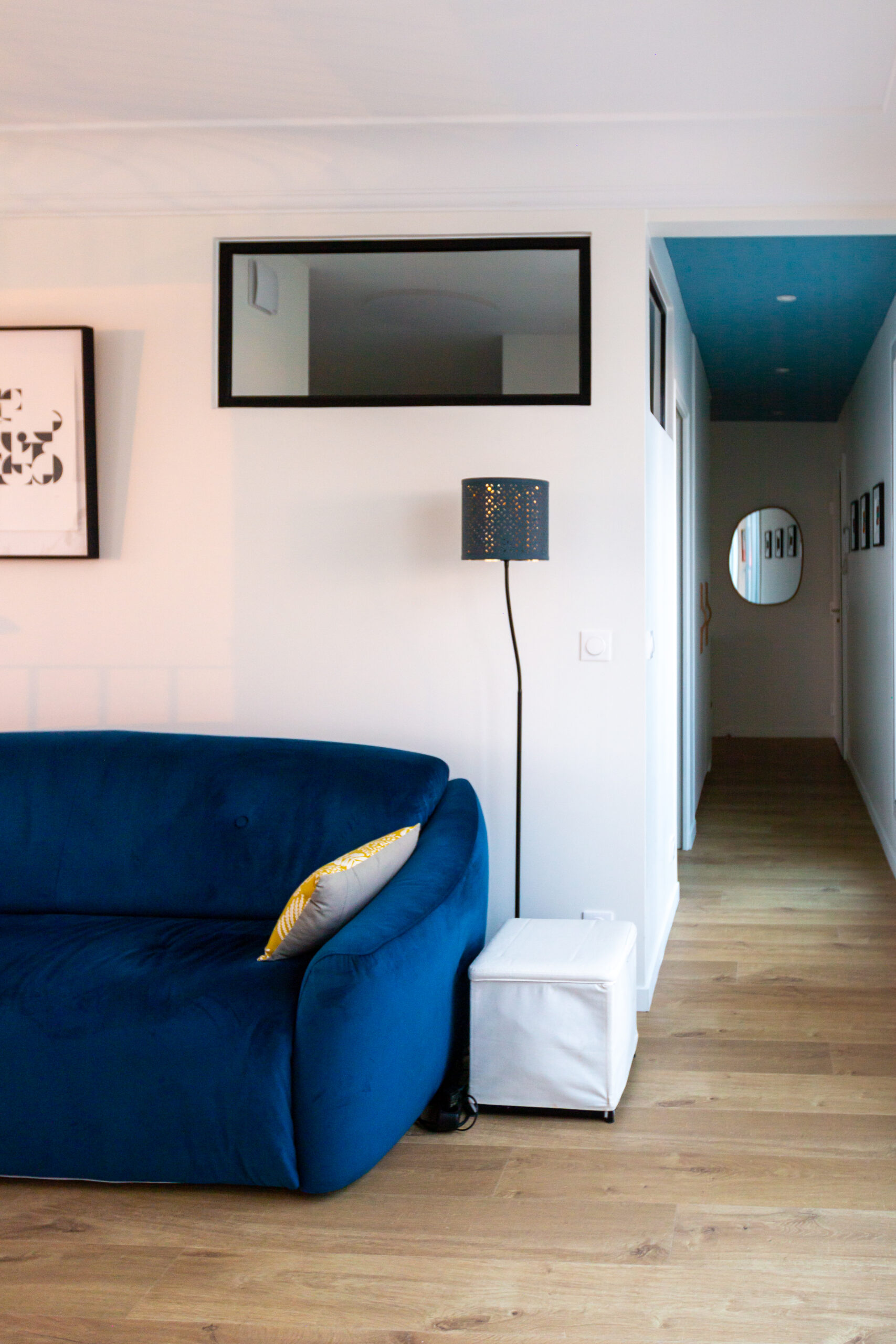 La couleur se joue au plafond comme un fil conducteur.