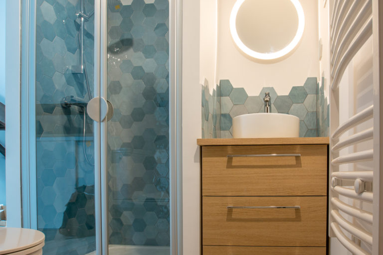 La salle de bains parentale avec des touches gold, sa faïence murale forme navette et son sol imitation carreaux de ciment. Les meubles en bois en bois et la peinture murale apportent un contraste et une touche chaleureuse. La baignoire d’origine a été récupérée et repeinte, une grande douce a été installée.