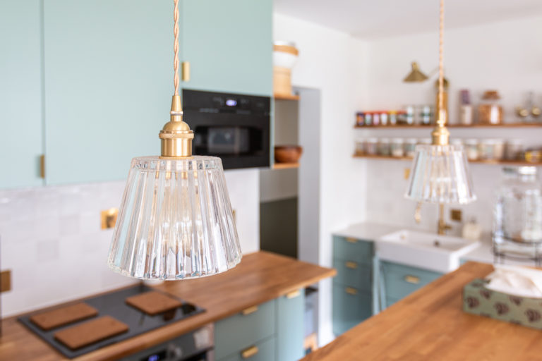 Ici les matériaux créent un mix chaleureux avec des touches précieuses de bois, zellige blanc et touches doré, poignées laiton, des façade laquées dans un vert tendre, du chêne, et un plan de travail en corian effet marbre côté zone eau.